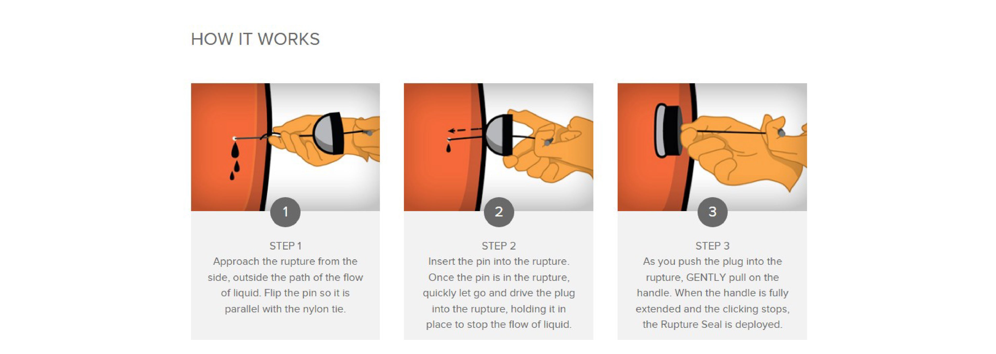 Rupture Seal™ products come in 4 sizes and are compatible with over 40,000 substances—more than any other product on the market. In seconds, it creates an instant, mechanical seal to plug even rough, unclean, or splintered surfaces. Ideal for controlling water leaks, fuel and chemical spills, hazmat situations, and transport container ruptures.