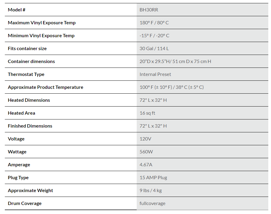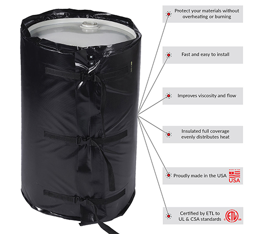 Powerblanket’s 30-gallon drum heaters provide a range of heating solutions for warming and storing temperature-sensitive materials. Our patented design eliminates hot and cold spots by applying uniform full-coverage heat across the entire surface of the container, allowing users to keep their materials at the proper viscosity while remaining at specified thermal levels. Each drum heater can be equipped with either an adjustable or a fixed thermostat. The 30-gallon drum heater comes in two voltages: 120 volts and 240 volts. Choose between three different thermal rating classes: