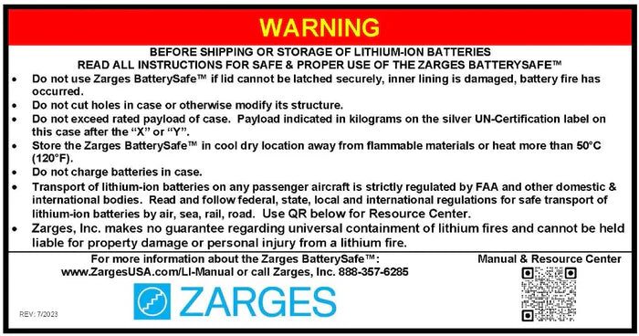 Zarges BatterySafe cases feature special insulated flame-resistant lining and are tested to safely store and transport* Lithium-Ion batteries.
