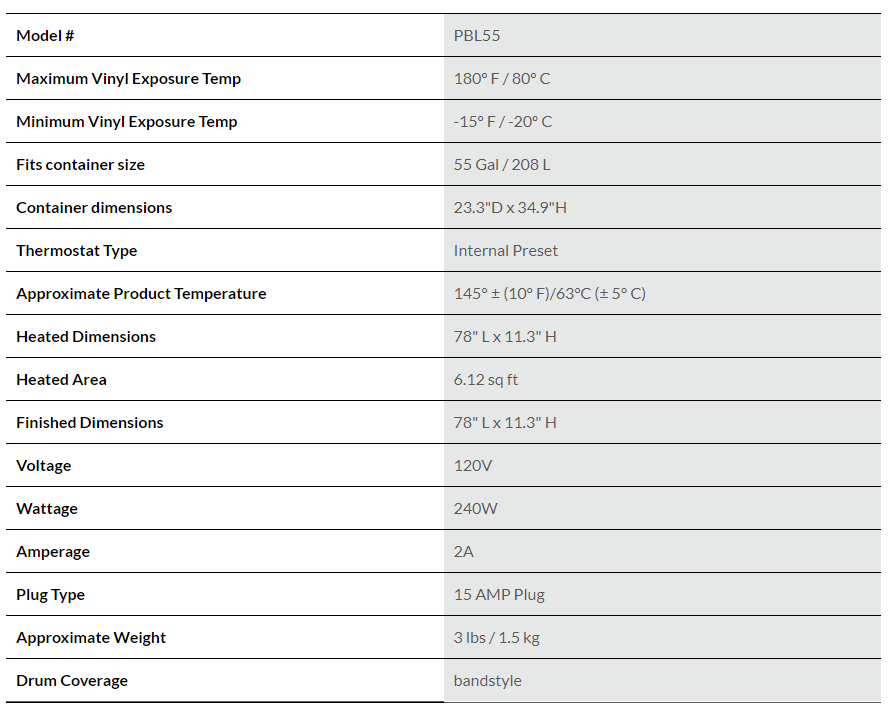 All of our 55-gallon drum heaters come as an insulated full-wrap design with cinch straps to secure a tight fit. They’re also water-resistant and can be used on poly and steel drums. All Powerblanket products are ETL certified to UL, CSA, and CE safety standards.